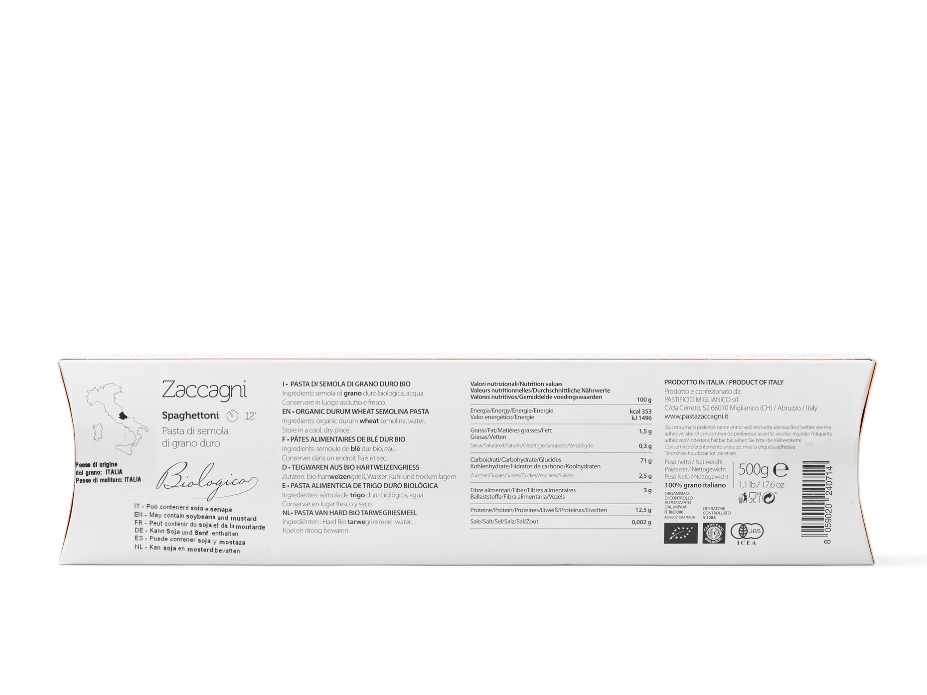 Die Spaghettoni von Pasta Zaccagni werden aus ausgewähltem Hartweizengriess und reinem Wasser aus der Majella (Quelle Mjella) hergestellt. Durch die Herstellung mit Bronzeformen erhalten sie eine raue, gerillte Oberfläche, die ideal ist, um reichhaltige und aromatische Saucen perfekt aufzunehmen.